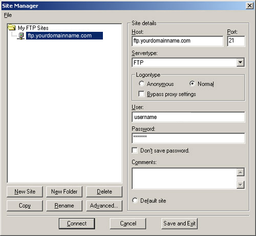 is used by webmasters from all over the world. Getting StartedTo upload your content with an FTP program, you'll need several settings, which will be in your User Account Info email that we sent you when your account was created. Here are the settings you'll need (replace yourdomain.com with your domain name.
