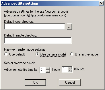 Also in the Server timezone offset section, set Adjust remote file time by to -3 hours. Here, you may also specify the local and remote directories for your web content. In general, your content will go under the public_html directory on the remote server. Click OK to save the advanced settings. |