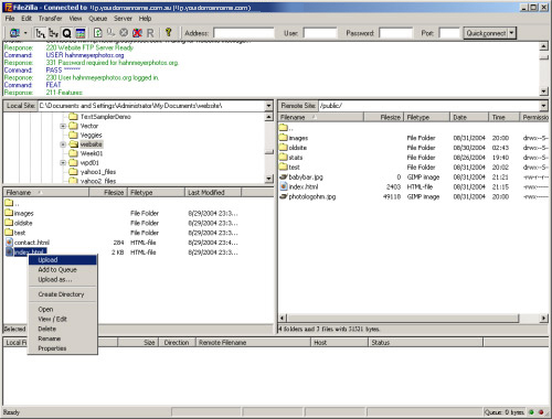 | 4. | On the left side of the window, right mouse click on any files or folders you would like to upload, and choose upload from the menu that appears. You'll see the status of your uploads and downloads along the bottom of the FileZilla window. |
